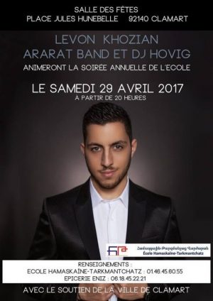 Nous aurons le plaisir d’accueillir Lévon Khozian, accompagné de l’orchestre Ararad Band, puis DJ Hovig qui vous fera danser jusqu’au bout de la nuit. La troupe de danse Ararat d’Issy-les-Moulineaux se produira également durant la soirée.